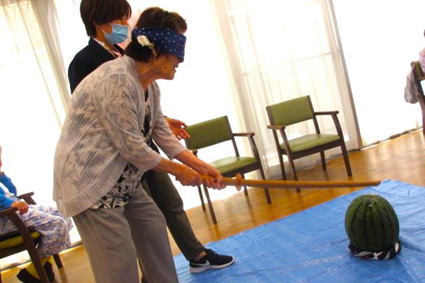 夏には地域の子どもたちをお招きし、施設内で夏祭りを開催しております。ご利用者様は、子どもたちの喜ぶ様子を想像しながら、当日の飾り付けや景品の準備をしてくださっています。当日は、ご利用者様のご希望に合わせて法被を身につけて景品を配っていただくなど、様々な形でご参加いただいております。子どもたちの楽しそうな姿に、ご利用者様も自然と笑顔がこぼれます。
